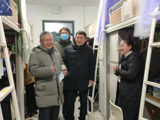 1月5日由朱建华书记带领办公室、学生处、研工部、后勤处、保卫处、相关学院协同对雁湖校区校园疫情常态化进行安全检查,提出对部分路段需要增设减速带,同时对学生公寓、留学生公寓进行安全检查。