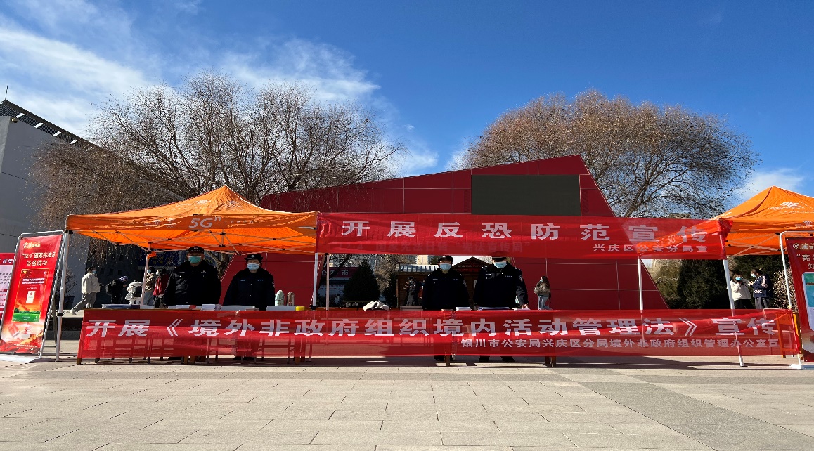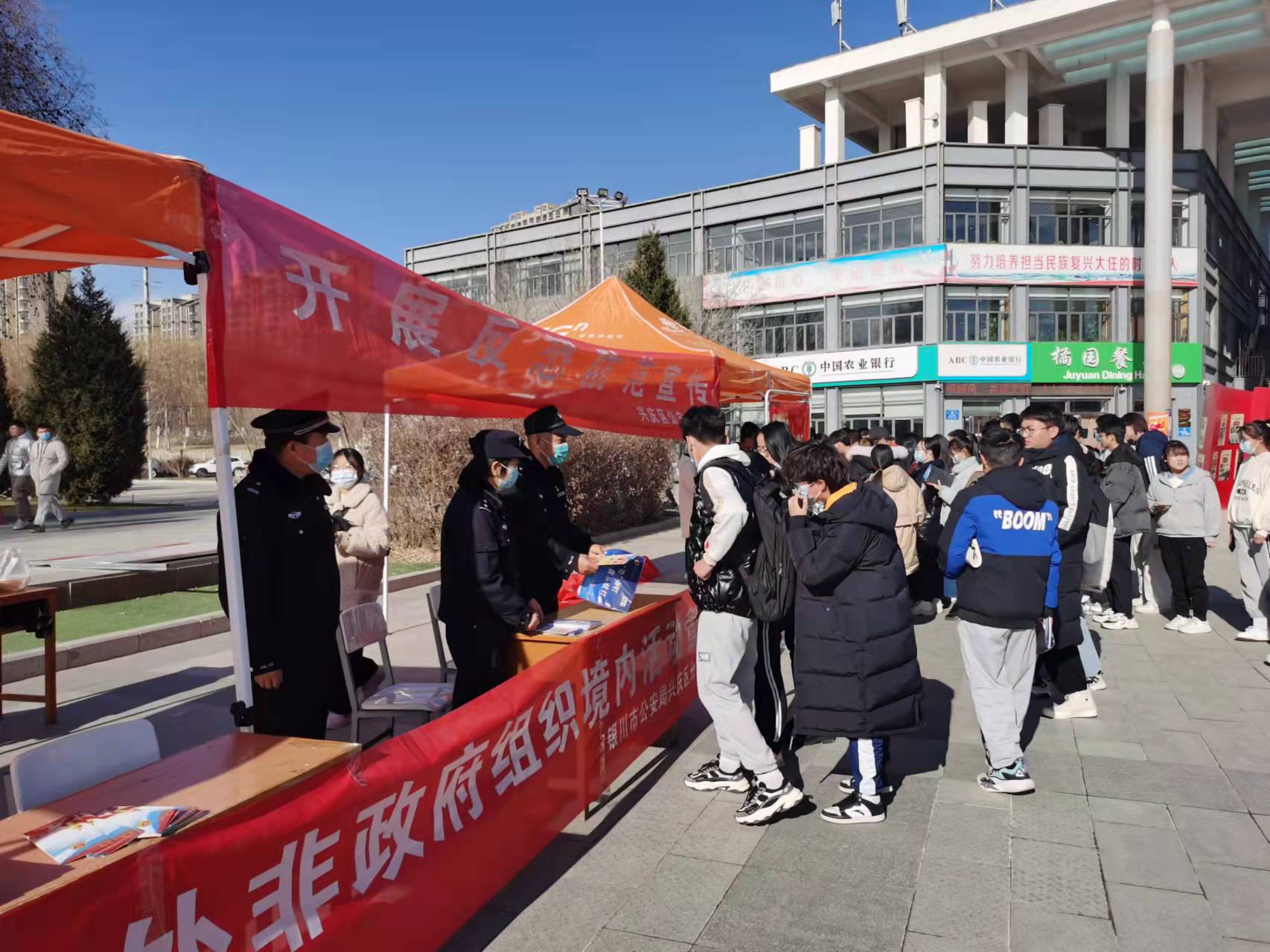 月3日中午,学校会同银川市公安局在雁湖校区尚德广场举行《境外非政府组织境内管理法》和反恐防范、反诈骗等宣传教育活动,银川市兴庆区公安分局部分警官、学校宣传部、学生处、保卫处、团委、研究生院和部分师生参加了此动。