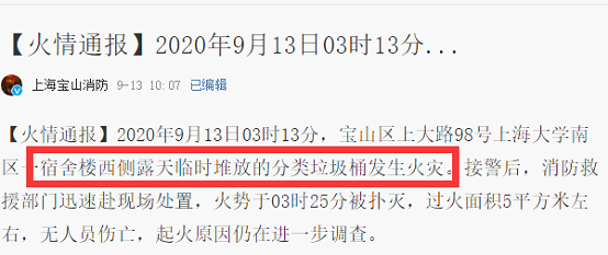 9月13日上午10时许,@上海宝山消防 发布火情通报:“9月13日03时13分,宝山区上大路98号上海大学南区一宿舍楼西侧露天临时堆放的分类垃圾桶发生火灾。接警后,消防救援部门迅速赴现场处置,火势于03时25分被扑灭,过火面积5平方米左右,无人员伤亡,起火原因仍在进一步调查。