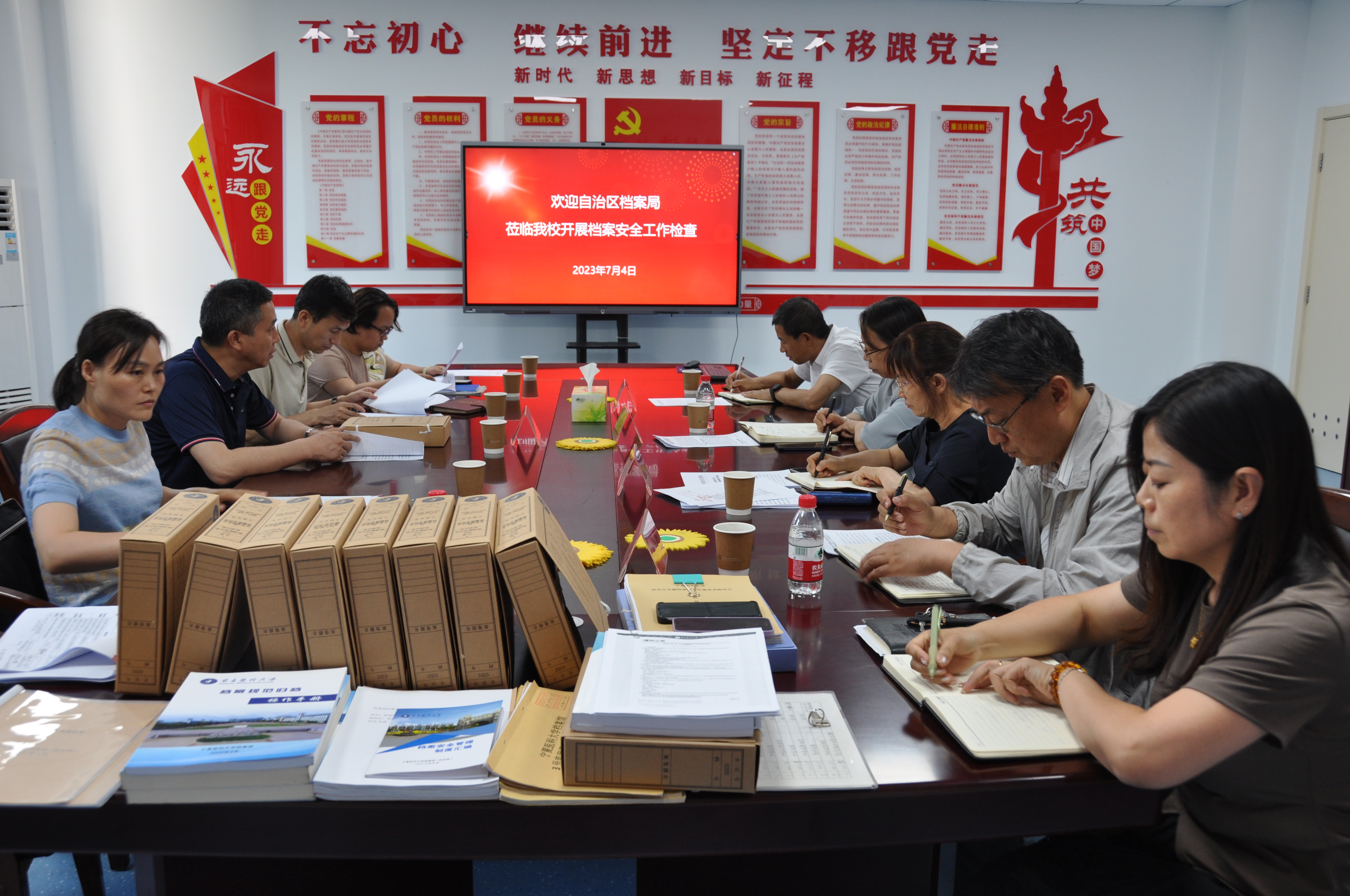 为深入贯彻落实习近平总书记重要指示精神,全面落实自治区党委2023年第20次常委会会议部署要求,切实加强档案安全工作,7月4日下午,自治区党委办公厅档案执法监督处吴彬海处长一行5人到校开展档案安全工作检查,听取档案安全隐患排查和整改工作汇报。杜勇副校长、档案馆、保卫处、网络信息中心负责人及相关人员参加了会议。