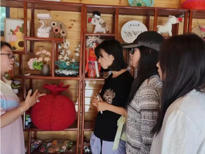 7月28-8月2日,实践团在同心县绣春塬手工坊开展了一场别具一格的民族团结主题活动。活动特邀吴忠市编绳非遗传承人尹学春老师现场教学,通过学习传统编绳技艺,生动地诠释了“各民族像石榴籽一样紧紧抱在一起”的民族团结理念。在非遗工坊内,尹学春老师首先展示了她与回、汉、蒙古等各族群众共同创作的大型编绳作品《同心石榴》。这件由365根红丝线编织而成的艺术品,每一颗“石榴籽”都由尹老师及其所带领的同心县老百姓共同串制,耗时8个小时,象征着一年365天各民族团结相亲的美好寓意。尹老师深情地说:“编织时,我们不分民族,只想着怎样把最美的祝福编进去。”