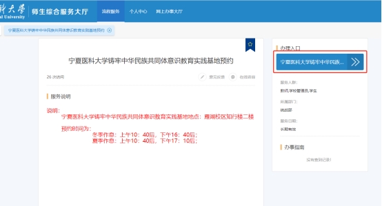 为了进一步简化工作流程,方便师生依托学校铸牢中华民族共同体意识教育实践基地开展相关活动,统战部依托网上办事大厅开通了“铸牢中华民族共同体意识教育实践基地预约”线上服务流程。现已正式上线运行。