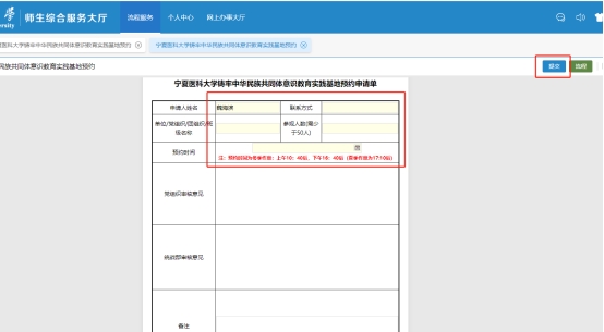 (4)填写申请人姓名、联系方式、单位/党组织/团组织/班级名称、参观人数(不超过50人)、预约时间,点击页面右上角的【提交】。