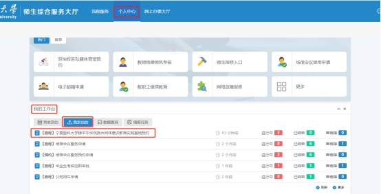 (6)如要查看预约记录,进入流程服务大厅,点击顶部【个人中心】找到【我的工作台】,在【我发出的】中打开相应的服务,可查看发起记录。