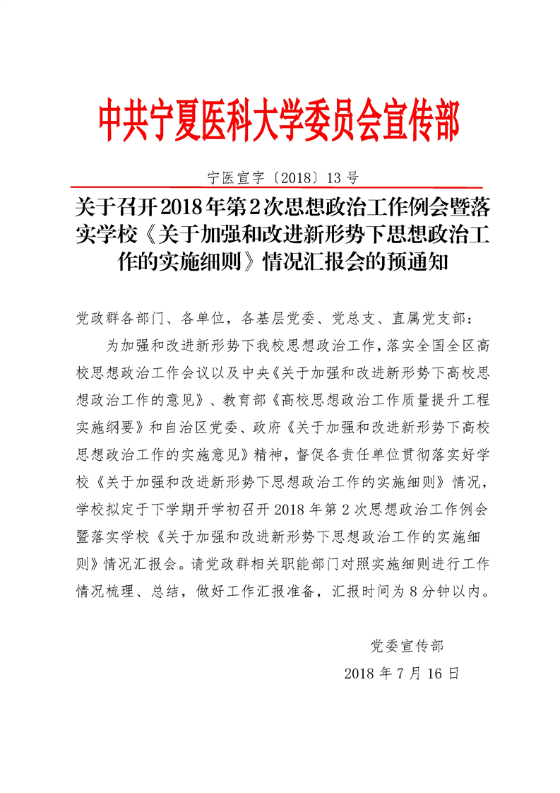 宁医宣字〔2018〕13号 关于召开2018年第2次思想政治工作例会暨落实学校《关于加强和改进新形势下思想政治工作的实施细则》情况汇报会的预通知