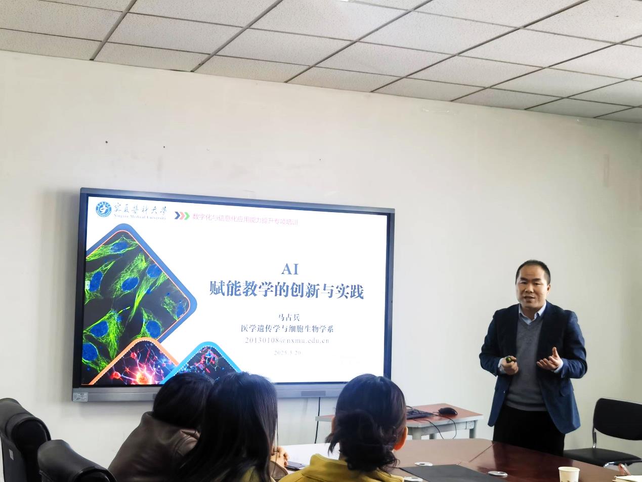 活动开始,作为自治区高等教师教学创新大赛二等奖获得者的马占兵老师以“AI赋能教学的创新与实践”为题,结合自身教学实践与参赛经验,从教学设计创新、信息技术融合、思政元素渗透等方面,分享“以赛促教”的实践心得。在“AI融入课程建设”专题交流环节,马占兵老师以国家级一流课程《医学细胞生物学》为例,详细阐述了AI技术在教学设计、资源共享、互动评价等环节的应用,并与参会教师围绕课程建设中存在的问题开展热烈讨论,提出利用AI优化教学资源分配、强化过程性评价等建设性意见。通过集体备课、竞赛练兵等多种形式传承学科发展,着力培育教学骨干队伍,助力青年教师专业发展。