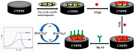 本研究中,构建了一种基于碳化钛/纳米金胶体复合物修饰碳纳米纤维离子液体糊电极(Ti₃C₂Tₓ/AuNPs@CNFILPE)的无标记电化学免疫传感器,用于幽门螺杆菌(H. pylori)抗体的检测。首先,表达并纯化了幽门螺旋杆菌(H. pylori)四价表位疫苗(FVpE),通过 Western blot 和 ELISA 研究了FVpE的免疫反应活性。接着,构建了基于Ti₃C₂Tₓ/AuNPs@CNFILE的生物相容性平台用于FVpE的固定。采用电化学阻抗法(EIS)和差分脉冲伏安法(DPV)对修饰电极的电化学性质进行了研究,讨论了修饰电极对FVpE的固定能力,评估了抗原与抗体之间的结合力。结合电化学传感技术和免疫分析技术,优化制备和检测参数,建立了幽门螺旋杆菌检测新方法。在最优实验条件下,该免疫传感器对抗H. pylori、CagA、VacA和UreA的线性范围均为0.1 - 5 ng mL -1,UreB的线性范围为0.1 - 4.5 ng mL-1,检测限低至1 pg mL-1。该免疫传感器良好的选择性和稳定性,可用于血清样本的分析。本研究构建的免疫传感器在H. pylori感染相关疾病的早期诊断和预后评估方面具有一定的应用前景,也为构建其他无标记肿瘤标志物免疫传感器提供了新思路。