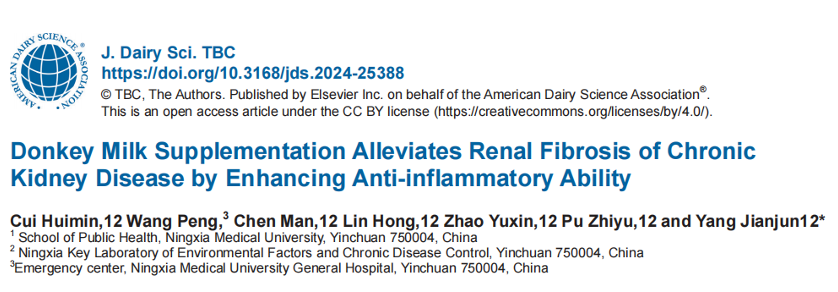 2025年1月,我院杨建军课题组在Journal of Dairy Science期刊(IF=3.7,中科院1区)发表了题为Donkey milk supplementation alleviates renal fibrosis of chronic kidney disease by enhancing anti-inflammatory ability的研究论文,揭示了驴奶可通过促进miR-223-3p的表达来提升慢性肾病大鼠的抗炎能力,进而延缓肾脏纤维化的进展,改善肾功能。