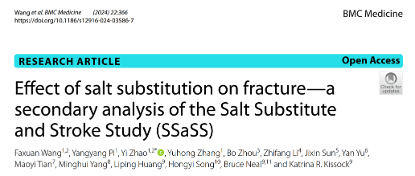 2024年9月4日,我院张毓洪教授课题组在《BMC Medicine》(IF=7.1,中科院医学1区)发表了题为《Effect of salt substitution on fracture—a secondary analysis of the Salt Substitute and Stroke Study (SSaSS)》的研究论文,揭示了盐替代品(低钠盐)与常规盐相比对骨折发生率无显著影响。