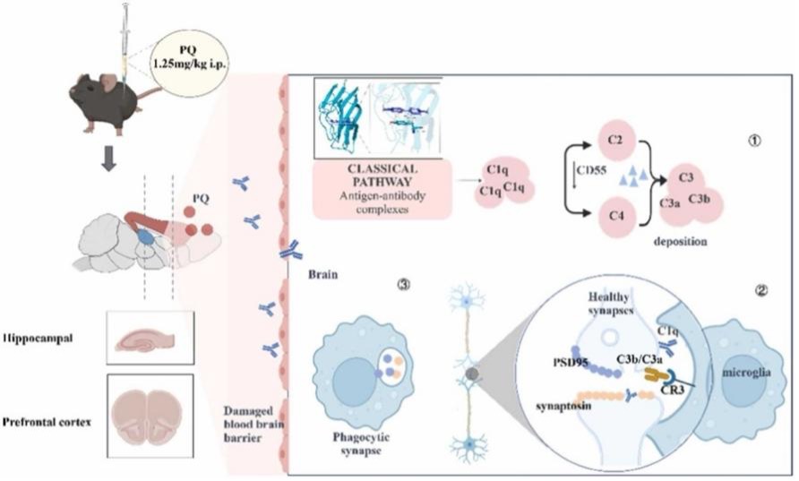 ①环境化学物PQ与补体C1q相互作用,引起经典补体途径激活。②补体C3a和C3b沉积在神经元突触后膜,并与小胶质细胞表面C3受体(CD11b/C3R)结合。③小胶质细胞过度修剪神经元突触,导致认知相关的非运动功能障碍。