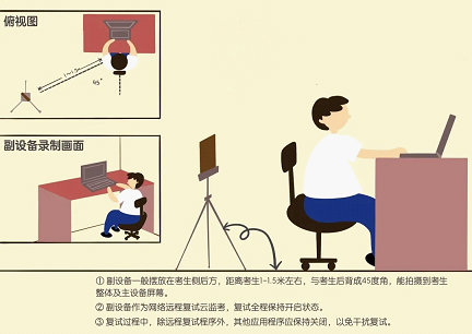 1.网络远程复试实行双机位,一台主设备用于正面拍摄,一台辅助设备用于侧后方监控拍摄。