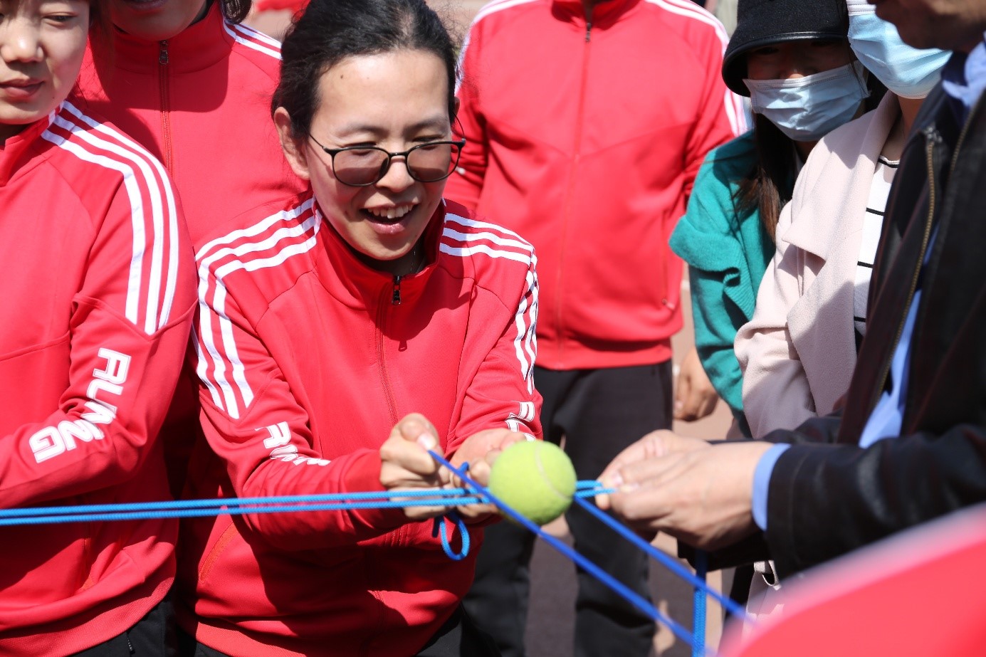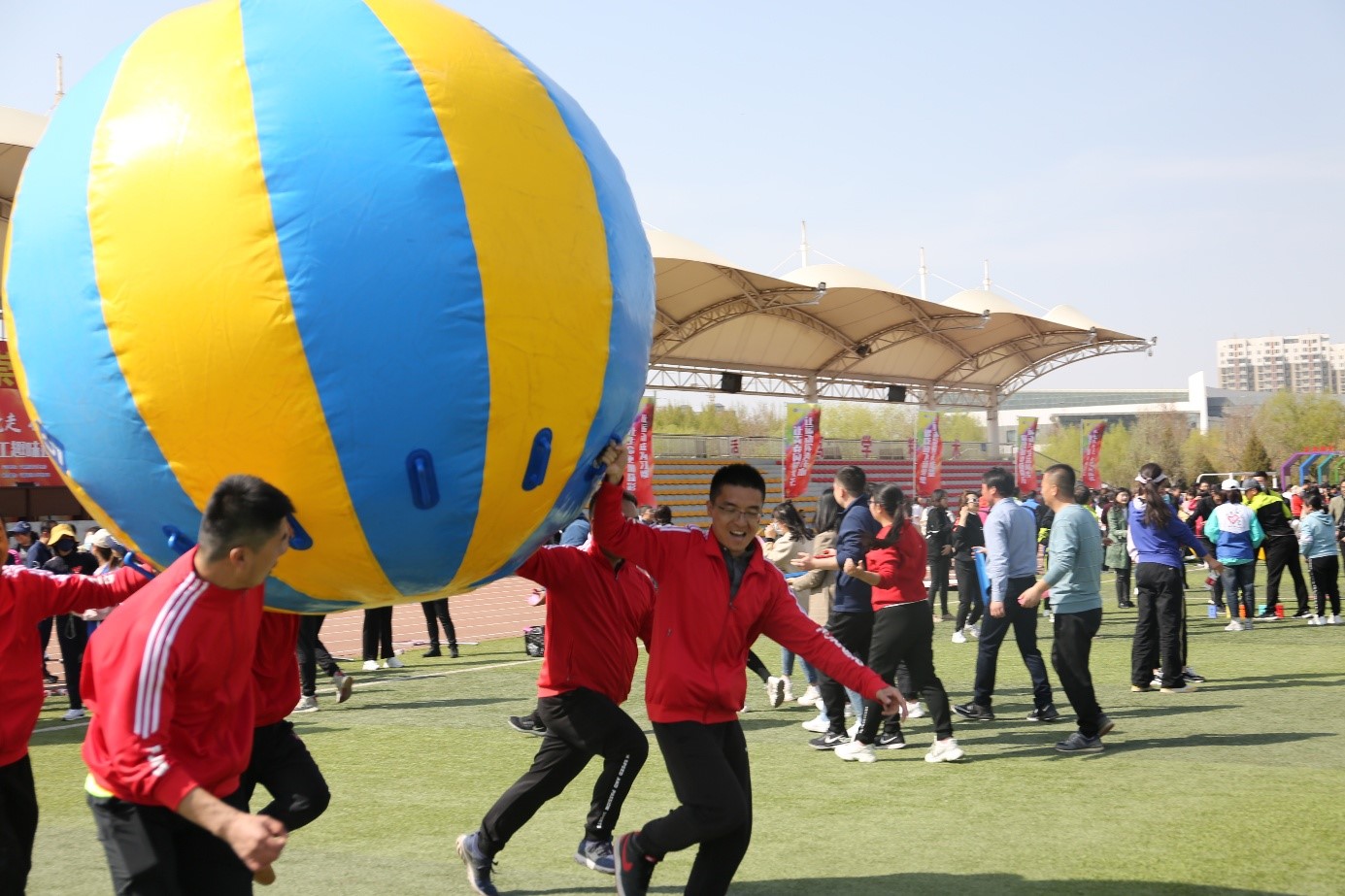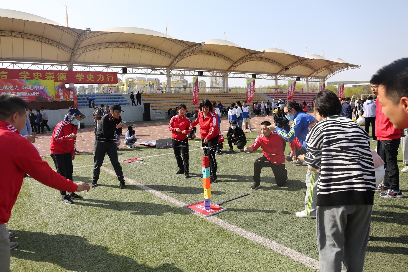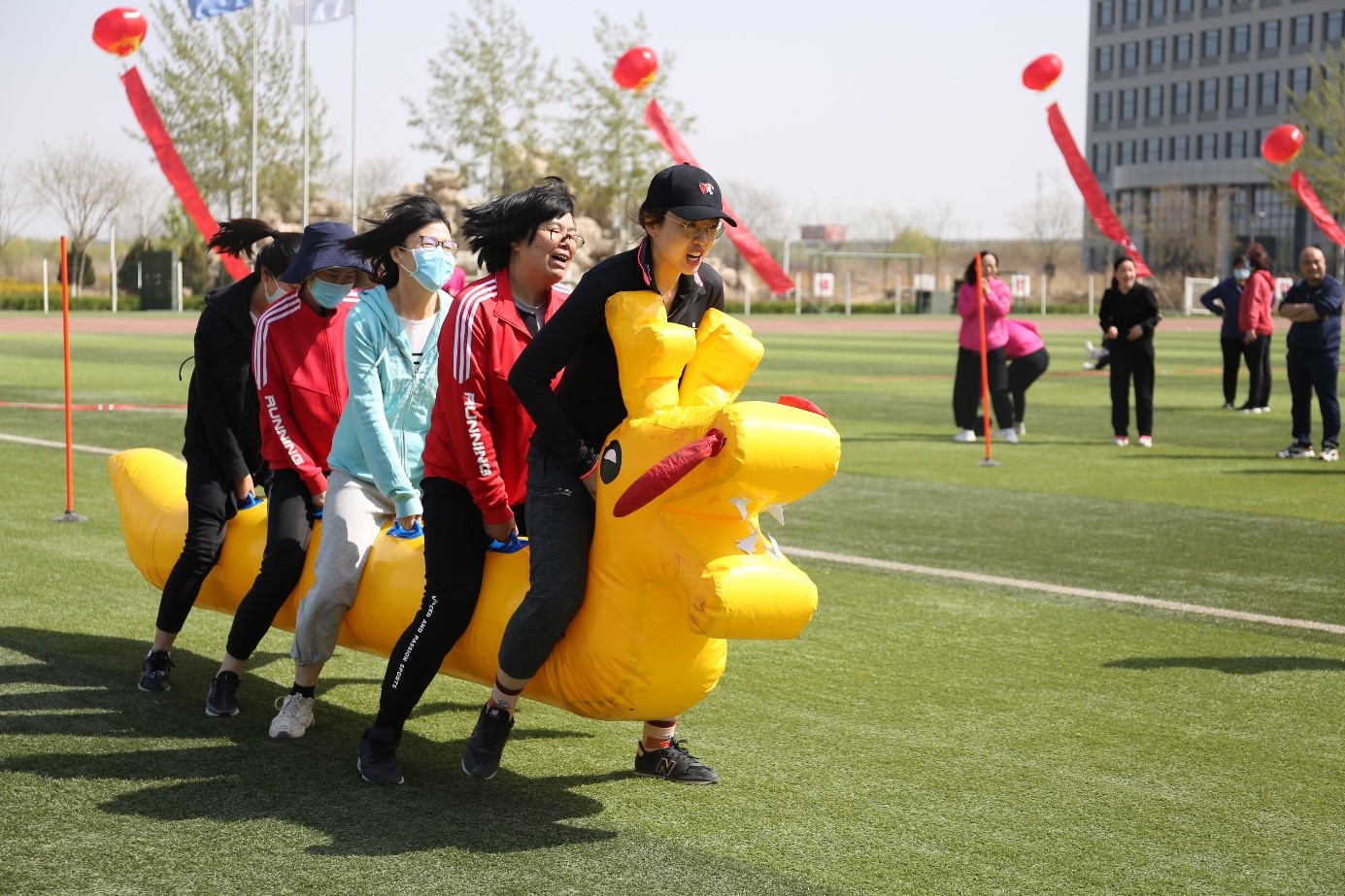 运动会当天,清风习习,赛场的温度也随着比赛的进行逐渐升温,大家积极参与的精神,顿时让赛事氛围达至高潮。本次运动会共有“穿衣接力”“扭转乾坤”“龟兔赛跑”“旱地龙舟”“能量传输”“合力搭建”“纵横天下”共7个项目。每个项目都充分调动了教职工们的肢体协调能力、团队合作能力、战术分配能力,使得每一场比赛的角逐都尤为激烈。