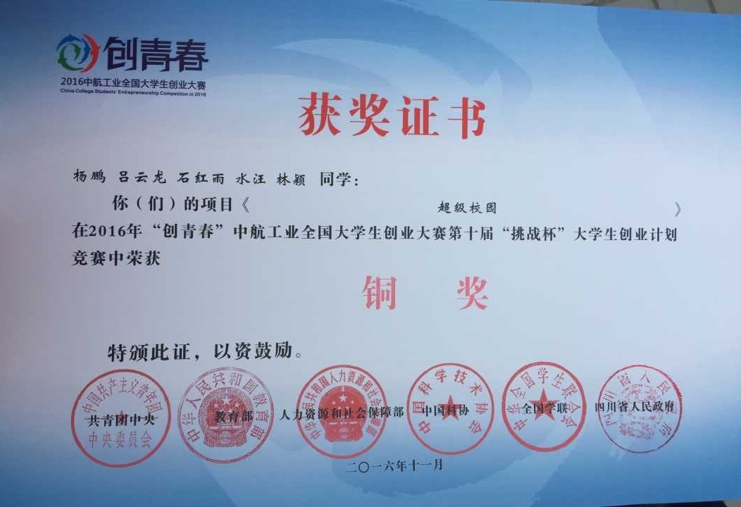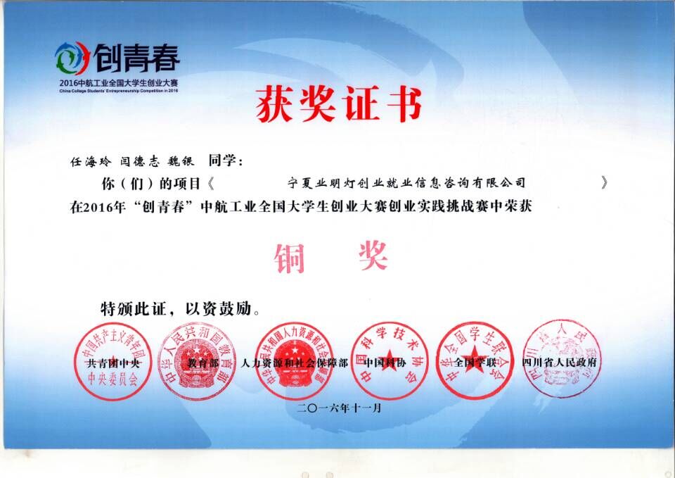 11月19日,由共青团中央、教育部、中国科协、全国学联等共同主办的2016年“创青春”全国大学生创业大赛终审决赛在成都落下帷幕。经过网络评审、集中复评、公开答辩及现场展示等环节,由眭睦、哈丽娜等老师指导的,闫德志、任海玲、水汪等同学具体参与的《超级校园》与《宁夏业明灯创业就业信息咨询有限公司》两项创业作品荣获全国铜奖。