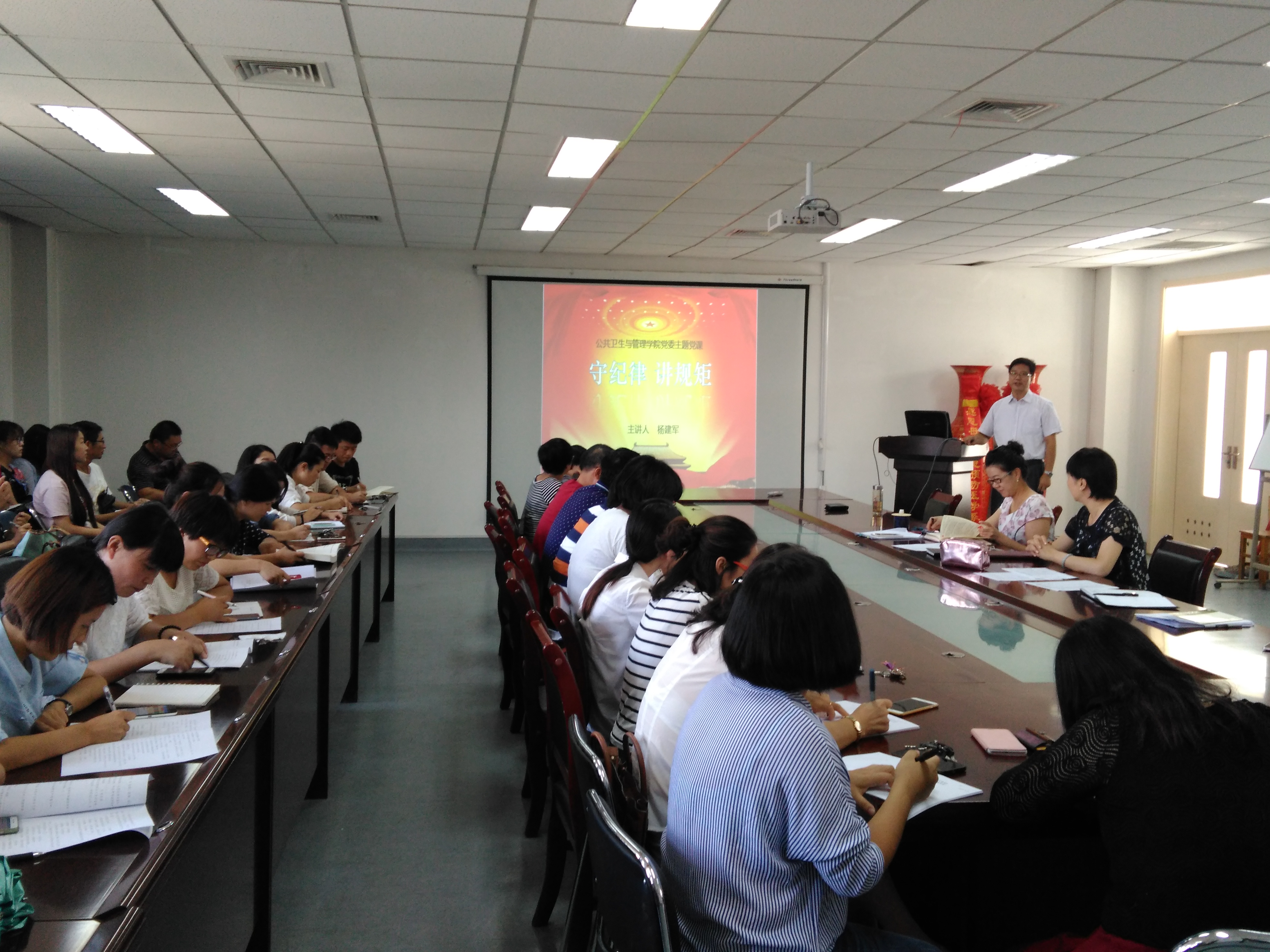 8月31日下午,公共卫生与管理学院学院在二楼会议室召开“两学一做”专题党课暨学习交流会。杨建军教授作《讲纪律、守规矩》专题党课,学院全体师生党员出席会议。会议由党委书记汤榕主持。