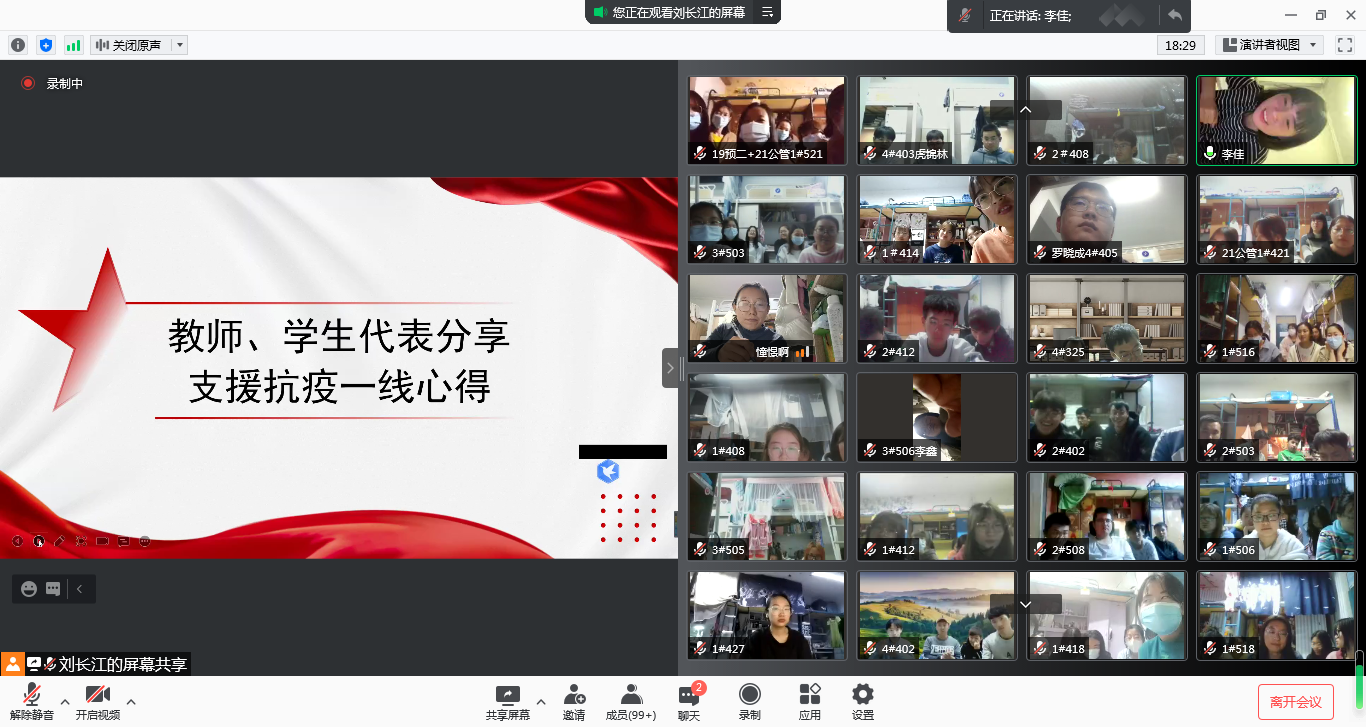 座谈会上,来自学院的师生代表踊跃发言,抗疫英雄们和大家分享了支援中宁、宁东参加一线抗疫工作的收获和体会。在校生们也分享了封校管理期间的学习生活状态,并提出了生活中遇到的一些问题,学院负责人一一进行了解答和说明。