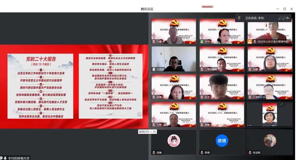 活动中,党员教师李玲以“欢庆党的二十大,培根铸魂育新人”为题做专题党课。随后,大家交流发言中一致表示,每一位教师都应该有时代责任,作为医学院校的教师,要继续践行立德树人的初心,做一个有温度、有高度、有深度、有广度的人民教师,尽最大的努力为学生上好每一堂课。党的二十大胜利召开后,更要用严格的尺子衡量自己,用更高的标准要求自己,不断努力提升自己。