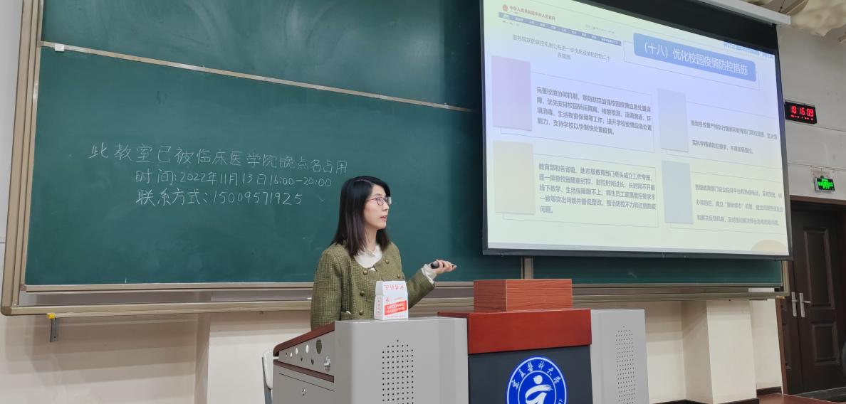 为贯彻国务院联防联控《关于进一步优化新冠肺炎疫情防控措施,科学精准做好防控工作的通知》精神,解读国家第九版防控方案、教育部第六版学校防控技术方案和优化疫情防控工作“二十条措施”之间科学精准防控的必然联系,进一步强化学生疫情防控知识,全面筑牢校园安全防线。公共卫生与管理学院师生宣讲团积极利用11月13日晚点名时间,对全校本专科生开展了线上线下共计30余场次宣讲。宣讲团成员以“新冠肺炎疫情最新防控措施解读”为主题,立足学校实际、发挥学历优势、利用专业知识,解读最新优化新冠疫情防控的有关措施。