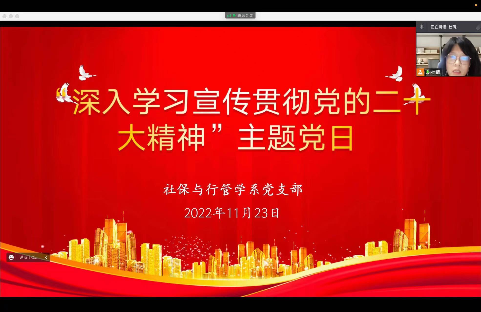 11月23日,公共卫生与管理学院社保与行管学系党支部通过线上会议开展“深入学习宣传贯彻党的二十大精神”主题党日活动。本次活动由学院社保与行管学系党支部书记程呈主持。