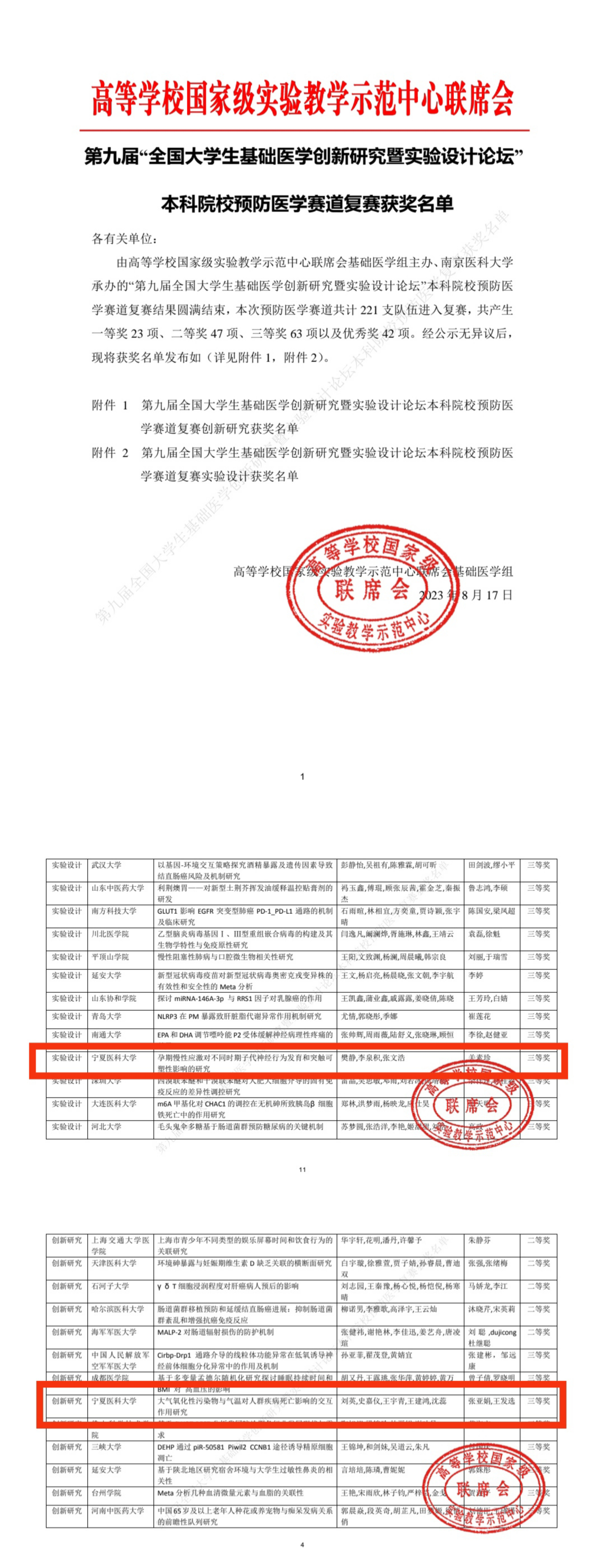 7月23日,由高等学校国家级实验教学示范中心主办,南京医科大学承办的第九届全国大学生基础医学创新研究暨实验设计论坛预防医学赛道复赛落幕。伟德公共卫生学院教师关素珍指导的樊静团队荣获实验设计组三等奖,张亚娟、王发选教师指导的刘英团队荣获创新研究组三等奖。