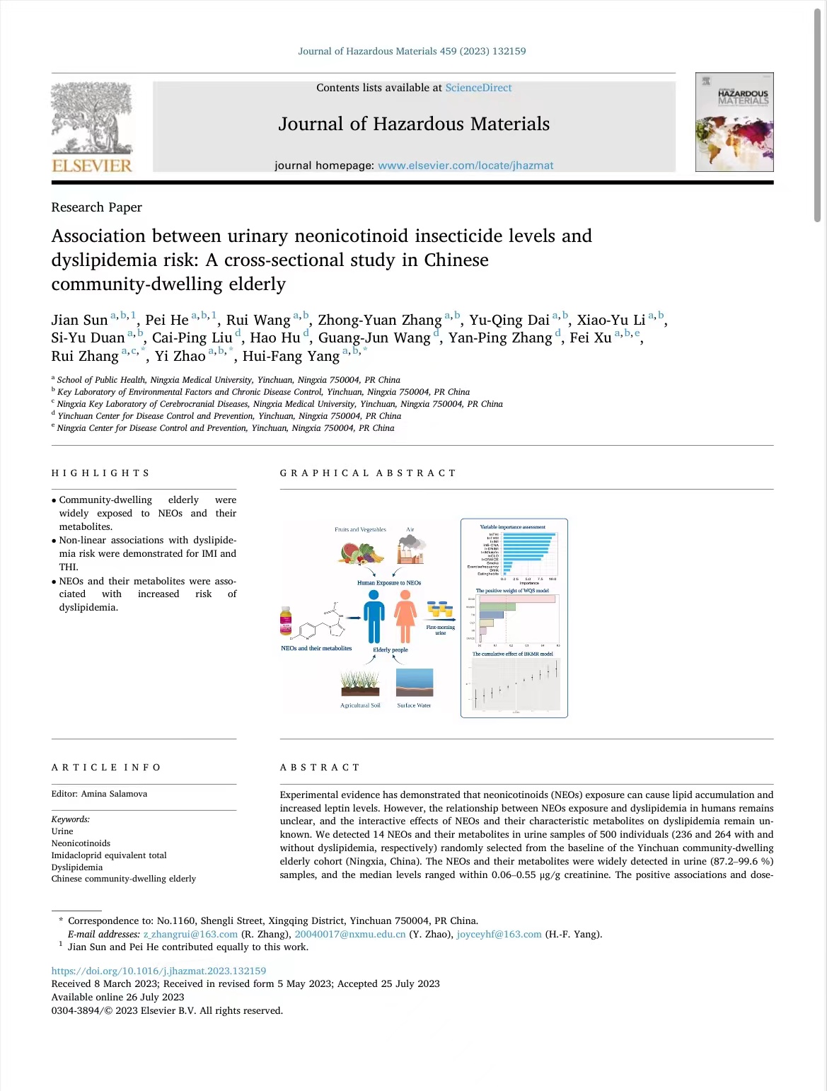 新烟碱类杀虫剂对老年人的血脂异常有没有影响?近日,宁夏环境因素与慢性病控制重点实验室、伟德国际1946源于英国公共卫生学院杨惠芳教授课题组在研究发现,老年人广泛暴露于新烟碱类杀虫剂,血脂异常患病风险可能与尿中新烟碱类杀虫剂水平之间存在正相关。该研究成果近日在国际专业学术期刊《危险材料杂志》上发表。