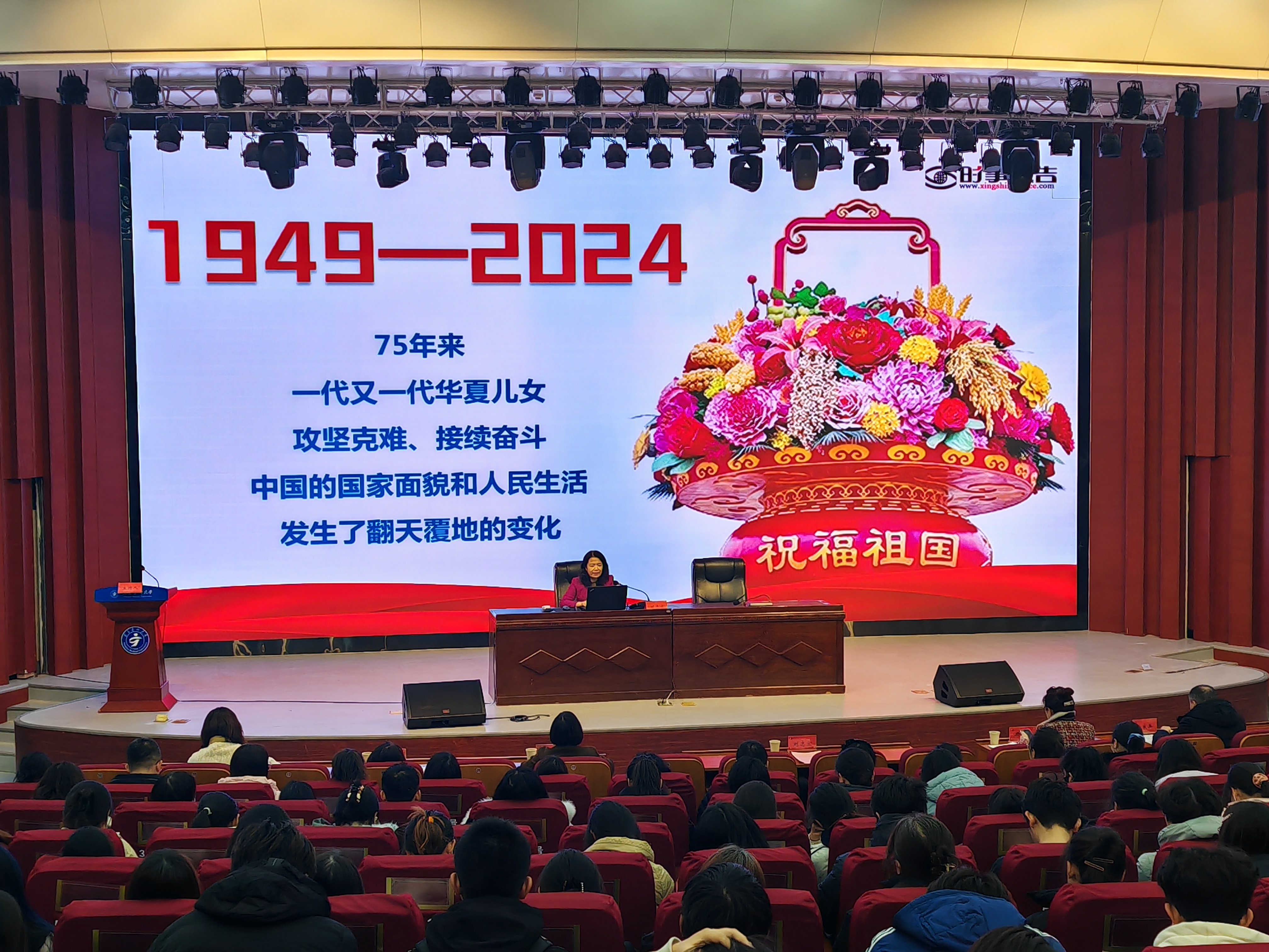 刘志宏围绕“七十五载迎盛世,砥砺前行续华章”这一主题,从我国经济持续健康发展、民主之路越走越宽、文化发展更加繁荣、人民生活极大改善和美丽中国焕发新颜5个方面内容,结合政策观点、详尽数据、视频案例、问题思考等全面准确地讲解了昔日国弱民穷的中国发生的历史巨变和75年来我们取得奋斗的结果。她要求在座青年学生在推进强国建设、民族复兴伟业中展现青春作为、彰显青春风采、贡献青春力量,奋力书写为中国式现代化挺膺担当的青春篇章。