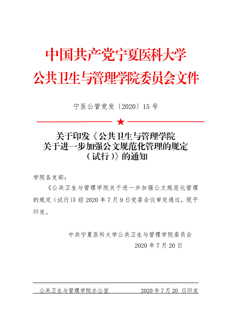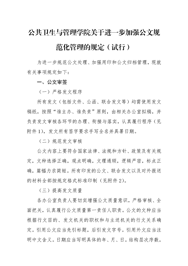 关于印发《公共卫生与管理学院 关于进一步加强公文规范化管理的规定 (试行)》的通知