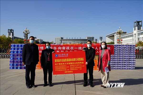 10月29日,银川新华百货连锁超市有限公司胜利店向学校捐赠抗疫慰问品,给学校送来夏进纯牛奶、康师傅方便面、达利园面包、矿泉水等慰问品。银川新百胜利店店长陈进亮表示,仅代表企业慰问学校工作在抗疫一线师生,向奋战在抗疫一线的宁医师生致敬,战疫情,共担当。