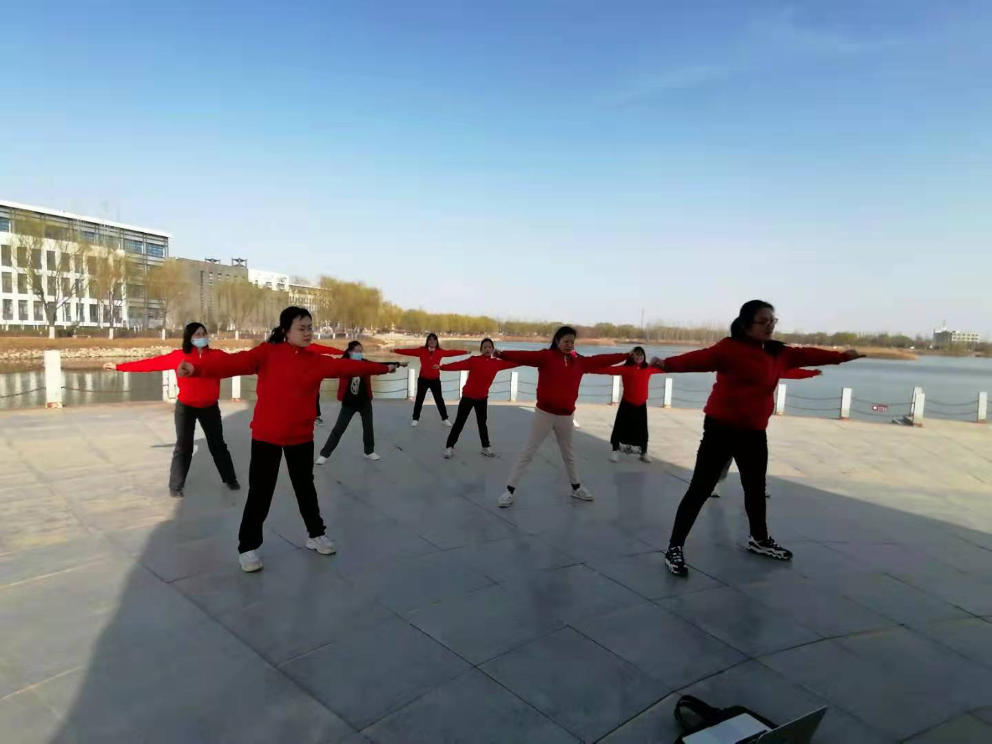 下午四点,活动在美丽的雁栖湖边准时开始。在动感的音乐中,分工会主席首先给女教工送上诚挚的节日祝福,之后带领大家学习有氧健身操。本次活动选择的有氧健身操动作简单易学,以瘦身效果好而著称,是风靡全国的健身舞蹈。在明媚的春光里,大家尽情挥洒汗水,享受属于自己的节日,欢声笑语洒遍雁湖。
