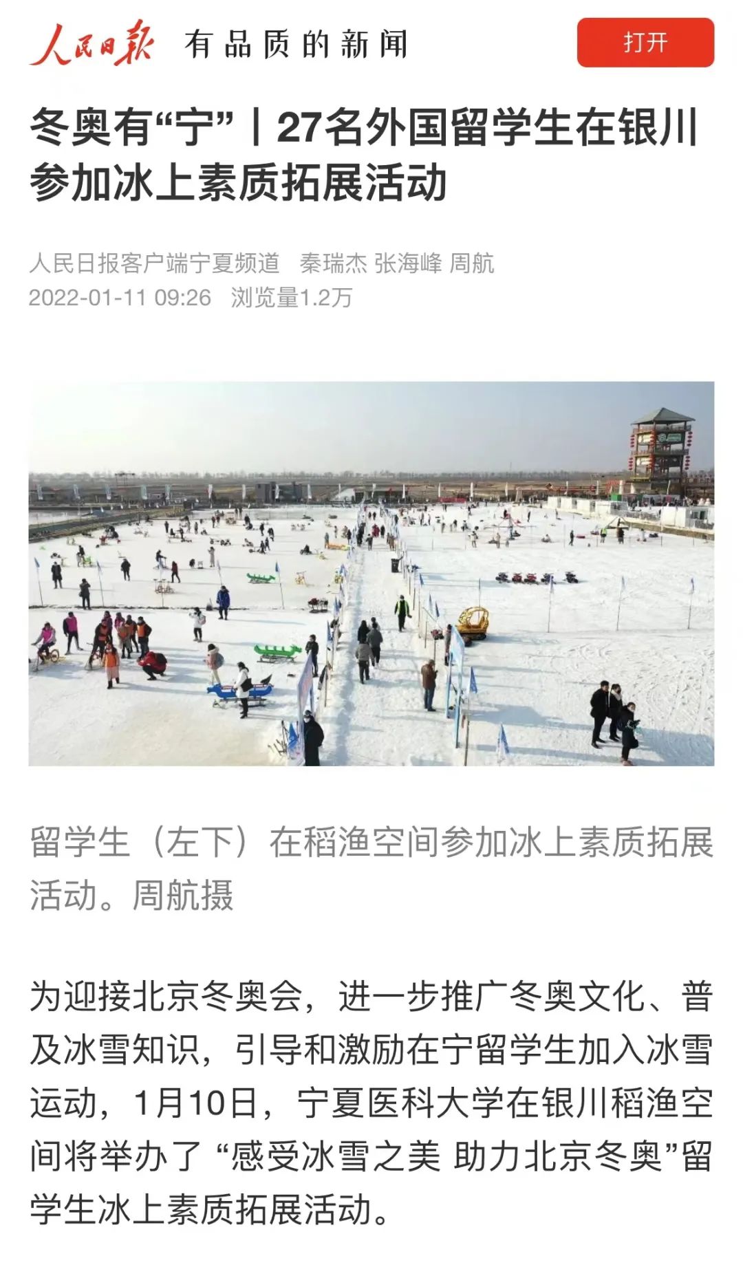 人民日报以《冬奥有“宁”丨27名外国留学生在银川参加冰上素质拓展活动》为题,报道了留学生们尽情享受冰雪运动的乐趣,为北京冬奥送上祝福。
