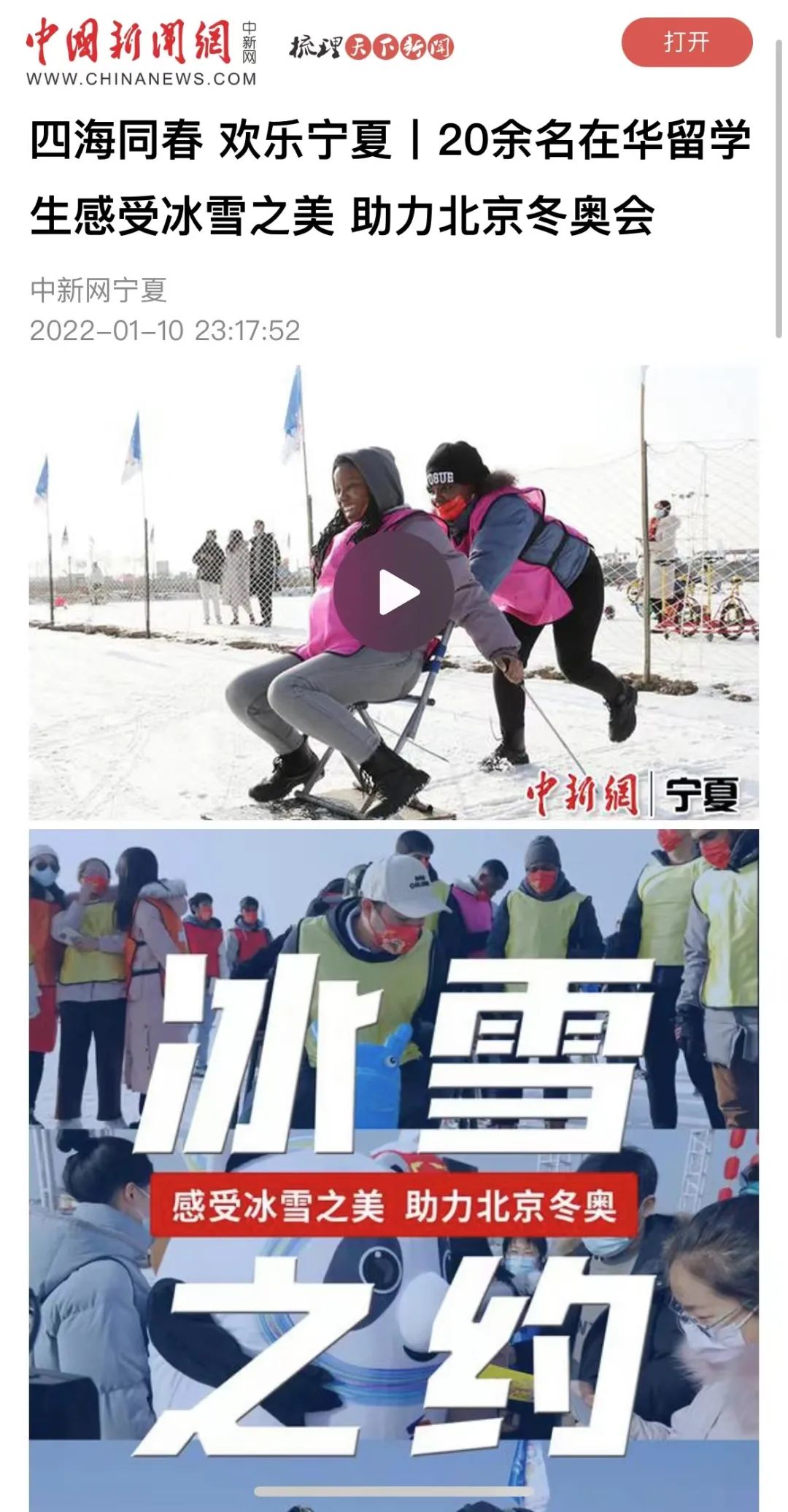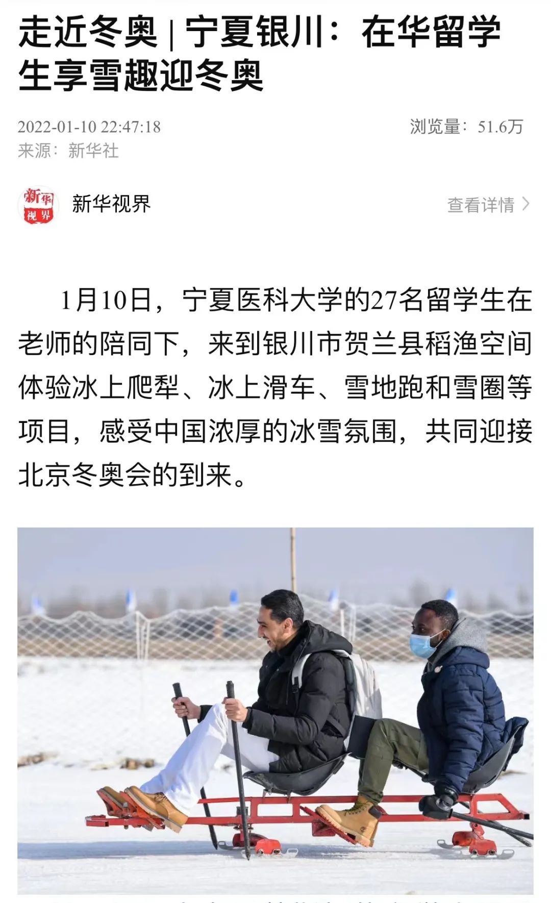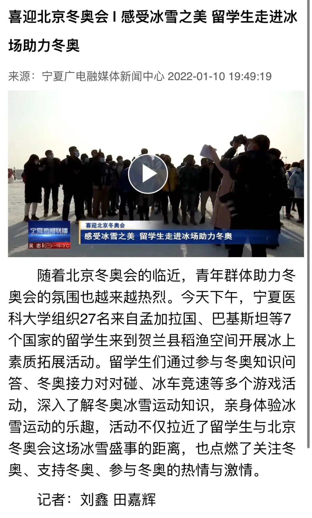 新华社以《走近冬奥 | 宁夏银川:在华留学生享雪趣迎冬奥》为题对宁医留学生的“冰上角逐”展开了详细的报道,图文并茂,充分体现了宁医留学生对冰雪运动的热情和对北京冬奥会的憧憬。