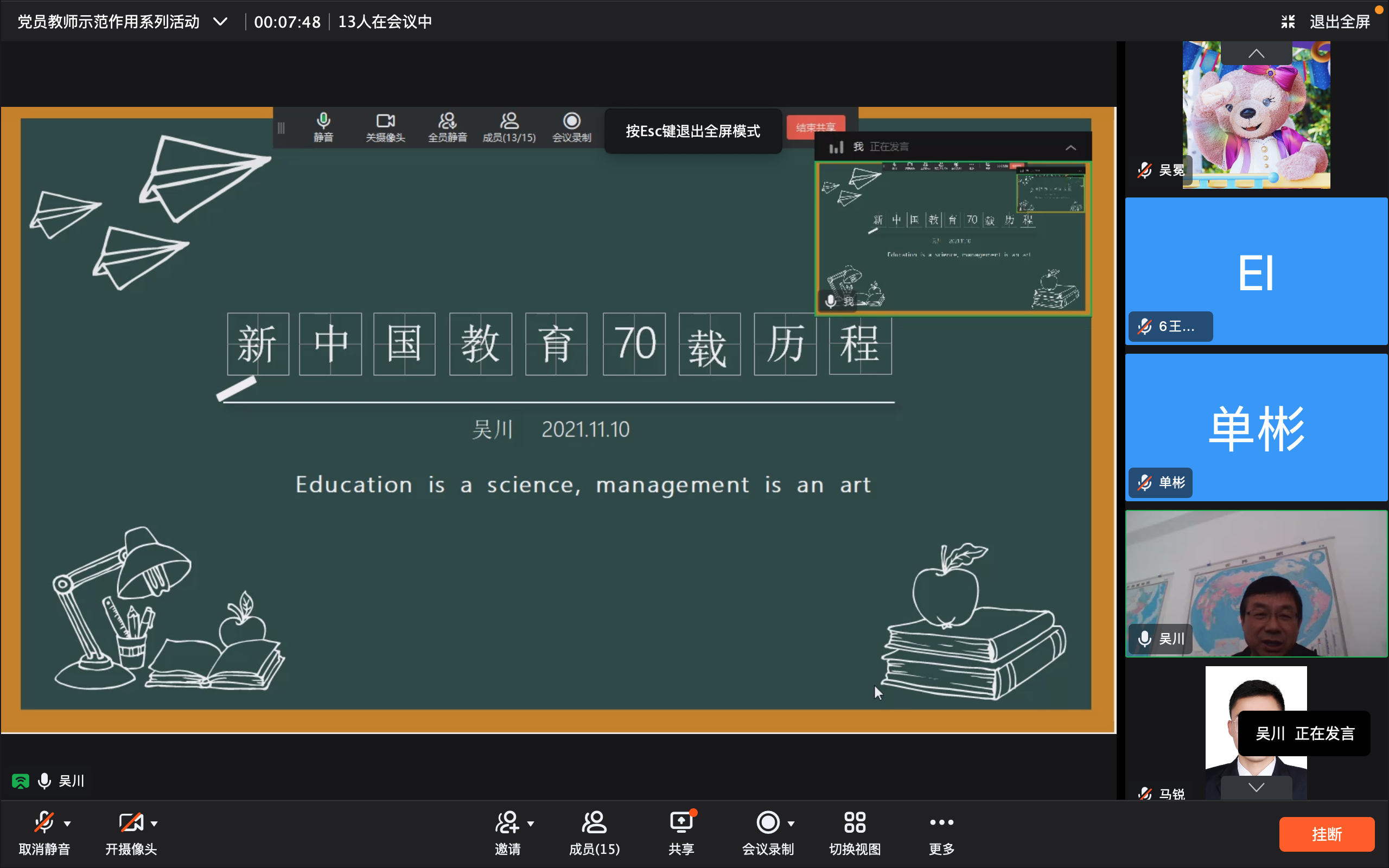 吴书记以重温新中国教育70载发展历程为载体,通过分享中国教育重要发展阶段的特征及意义,带领全体教师共同回顾中国教育发展之路,以一个“见证者”的角度分享自己的感受、经验,使全体教师更加珍惜当下,坚守责任。