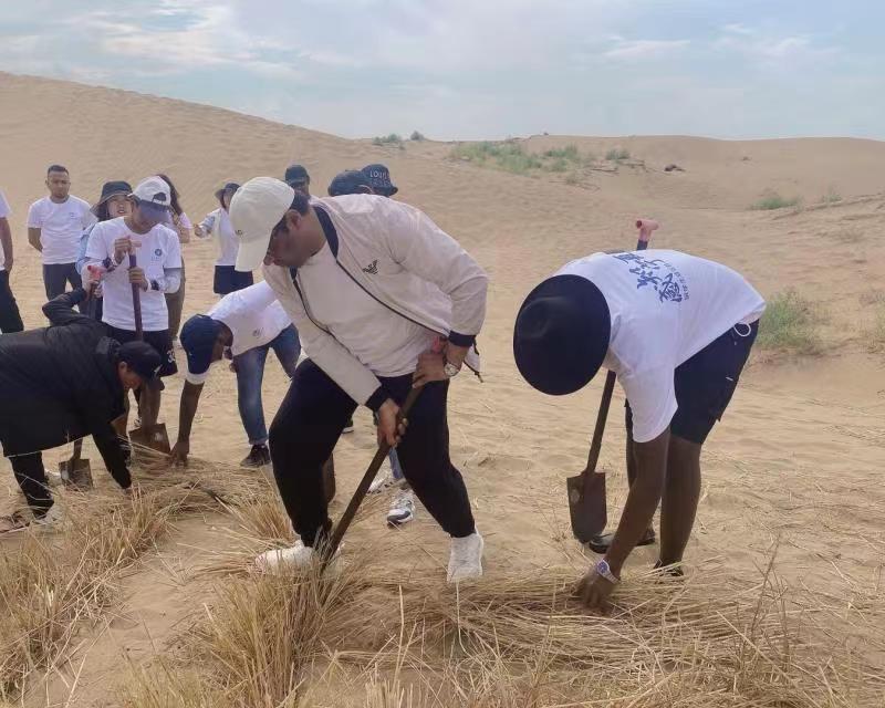 下午,留学生们来到了宁夏灵武白芨滩沙漠公园,了解了宁夏人民在长期实践中探索出的防沙治沙技术,感受了宁夏人民防沙治沙的智慧。来自印度的留学生林凯文说到:“我的家乡也有沙漠,我们对于沙漠有些‘束手无策’,很希望麦草方格技术也能在我的家乡推广。”