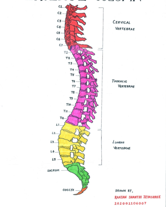 The Vertebral column is the central axis of the skeleton.It consists of5morphologically differentiated groups ofvertebrae, it includesCervical - 7、Thoracic - 12、Lumbar - 5、Sacral - 5、Coccygeal - 3-4.It consists of 33 vertebrae, connected by ligaments and intervertebral discs.