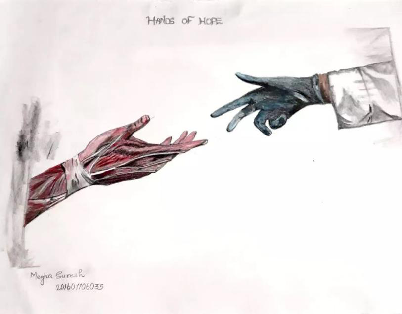 为我们病人带来希望和健康。希望之手是帮助、治愈、保护和安慰之手。今日用你的双手去给予病人希望,明日他人也会将希望之光赠与你。