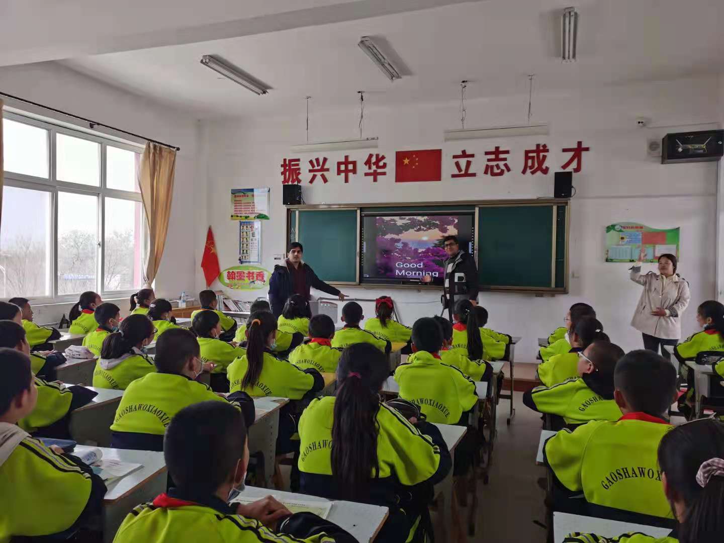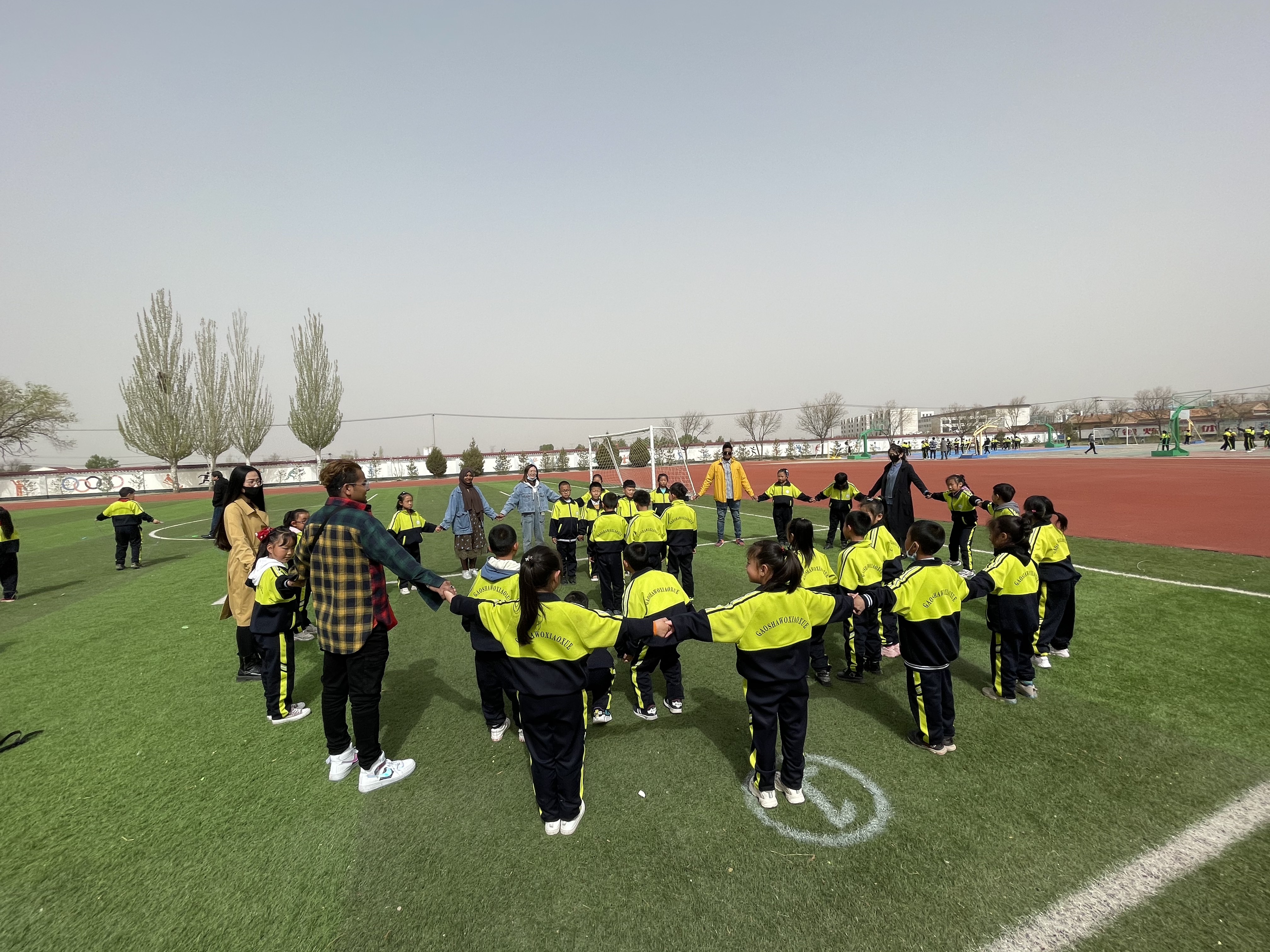上午,在盐池县高沙窝镇中心小学,大家首先观摩了“大课间操”,留学生们还与各年级小学生一起踢足球、打篮球、摇呼啦圈、踢毽子、打沙包,共同展示运动的激情与天使般的快乐。在“主题班会”环节,留学生们为小学生们开展了一堂趣味横生的互动课。留学生以各具特色的方式,或举行小比赛提高课堂活跃度,或寓教于乐,进行小游戏增添课堂趣味,大大提高了小学生的英语学习兴趣,课堂反响异常欢快热烈。留学生们以各自国家的地理位置、美食、风景名胜、风土人情等调动学生们的兴趣,四年级小学们的一曲“听我说-谢谢你”令留学生志愿者们激动不已,大家依依不舍“中国的孩子真聪明、幸福,祝福你们健康、快乐的成长……”。