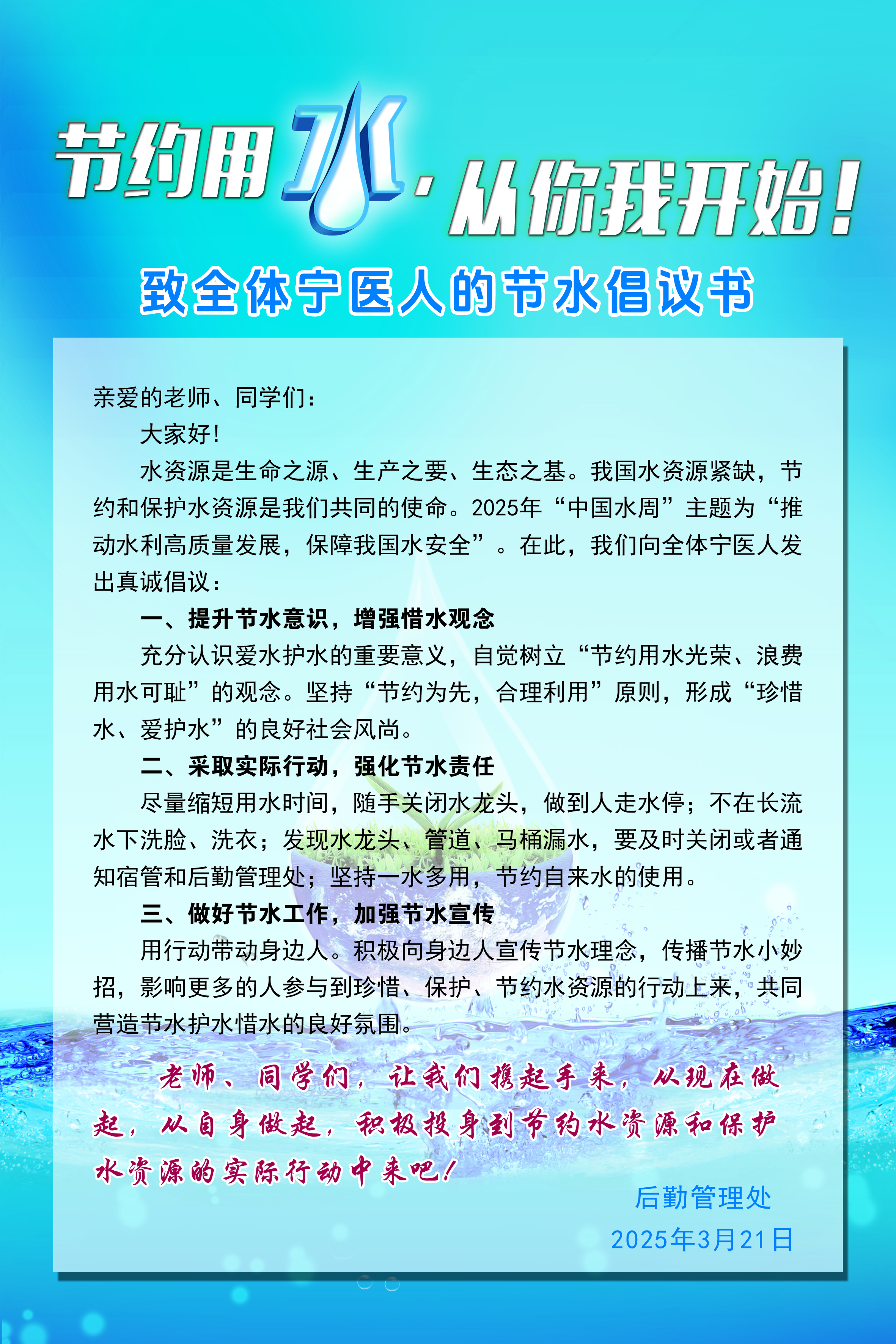 节约用水,从你我开始!——致全体宁医人的节水倡议书