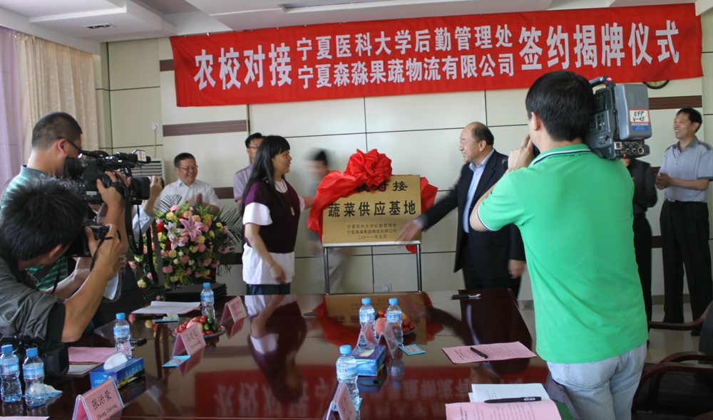 会上李正直副校长与宁夏林业研究所股份有限公司李健董事长共同为“农校对接”蔬菜供应基地揭牌。后勤管理处马建荣处长与宁夏森淼果蔬物流有限公司尹潭总经理共同签署《“农校对接”合作协议书》。