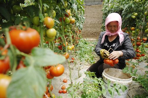 5月24日,宁夏森淼果蔬物流公司的工作人员在大棚内采摘成熟的番茄果实