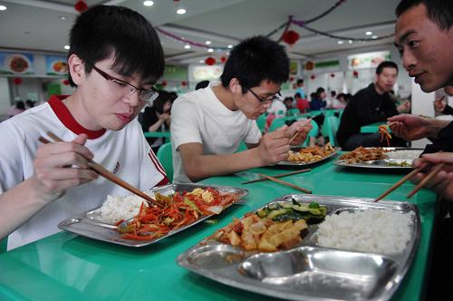 伟德国际1946源于英国的学生在食堂内吃番茄炒鸡蛋等炒菜