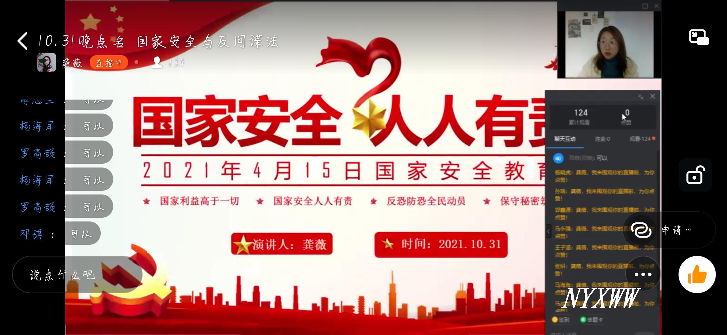 10月31日下午,为增强同学们的国家安全意识,提高维护国家安全的自觉性,理学院组织全体学生开展以“国家安全 人人有责”为主题的线上主题晚点名。晚点名开始,同学们观看了《中华人民共和国国家安全法》《中华人...