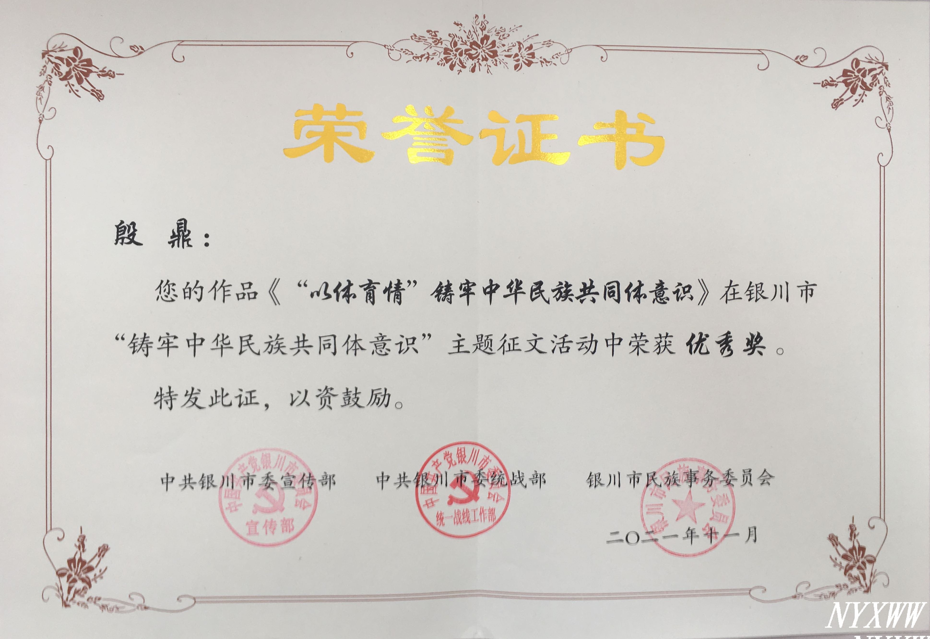 近日,由银川市委宣传部、统战部、民族事务委员会联合主办的“铸牢中华民族共同体意识”主体征文活动落下帷幕,体育部教师殷鼎的作品《“以体育情”铸牢中华民族共同体意识》荣获优秀奖。该征文活动自9月份开展...