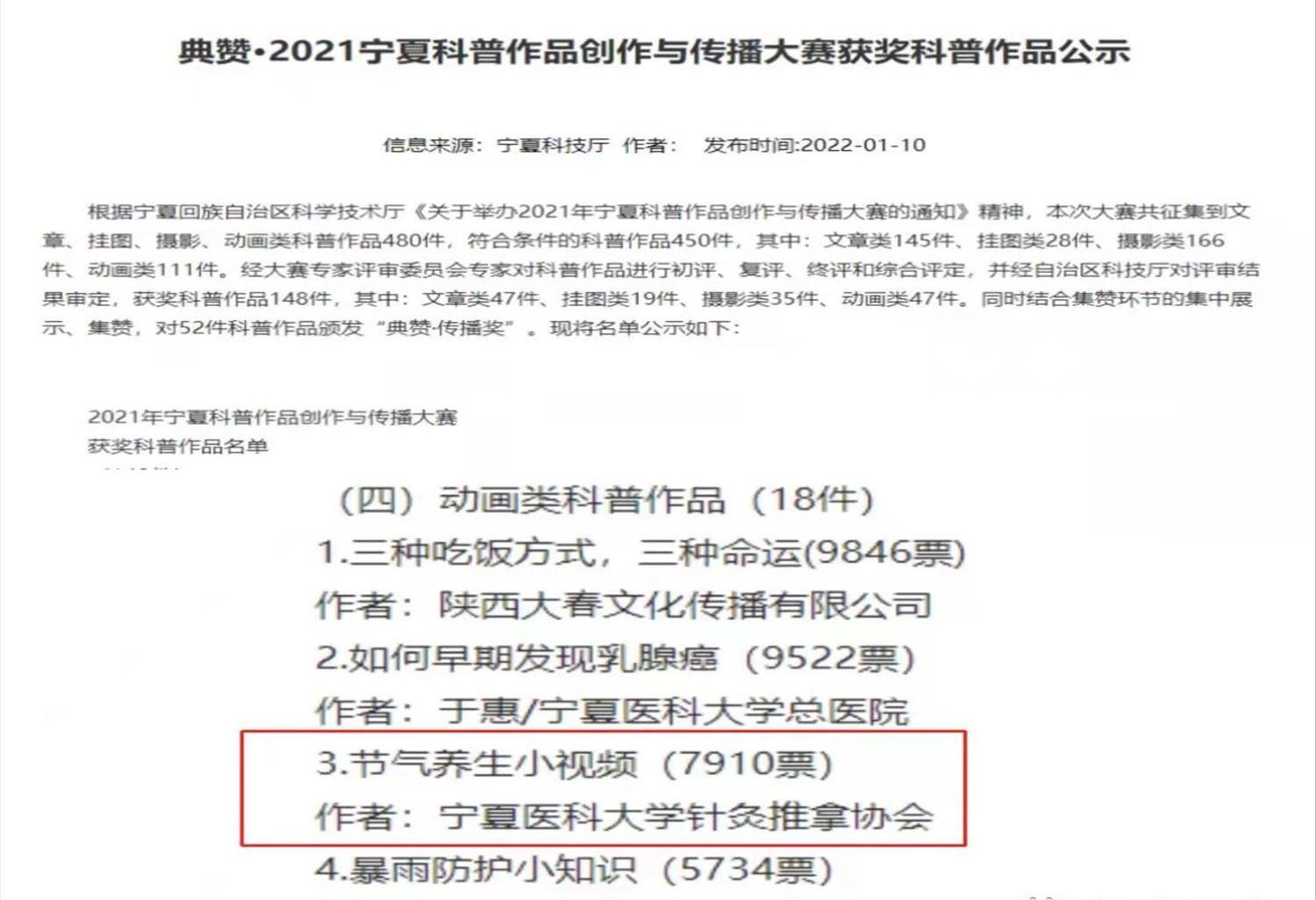 近日,自治区科技厅公布了2021年宁夏科普作品创作与传播大赛获奖结果,由学校针灸推拿协会制作的“节气养生小视频”获得动画类科普作品“典赞·传播奖”。中医学院高度重视中医药科普和文化宣传工作,积极响应自治...