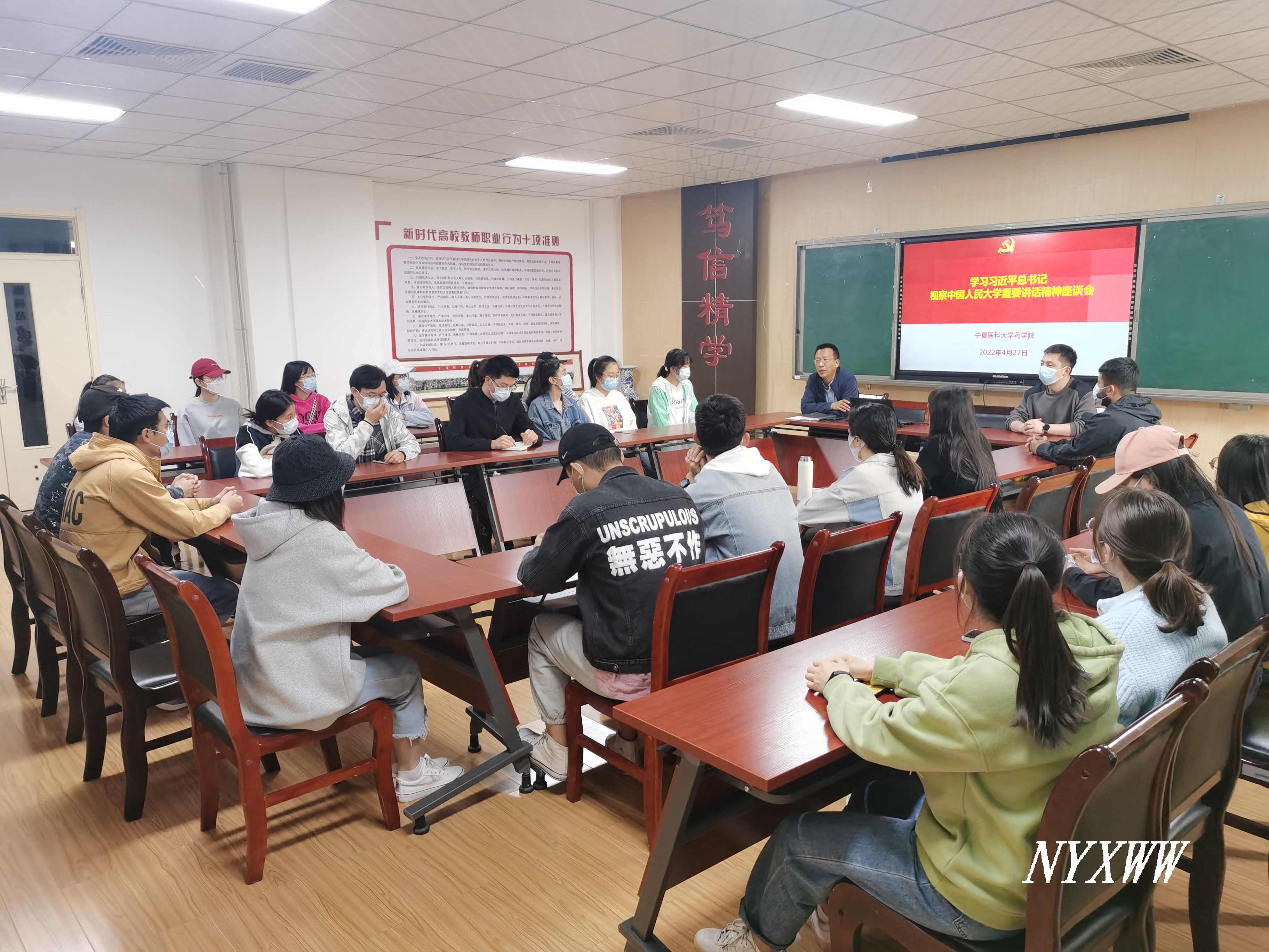 4月29日下午,药学院在润德楼205会议室召开教职工理论学习会,邀请中共宁夏区委党校社会与文化教研部教师刘智远开展了“坚守教育初心, 培养高尚师德”专题讲座,学院50多名教师参加。刘智远老师围绕习近平总书...