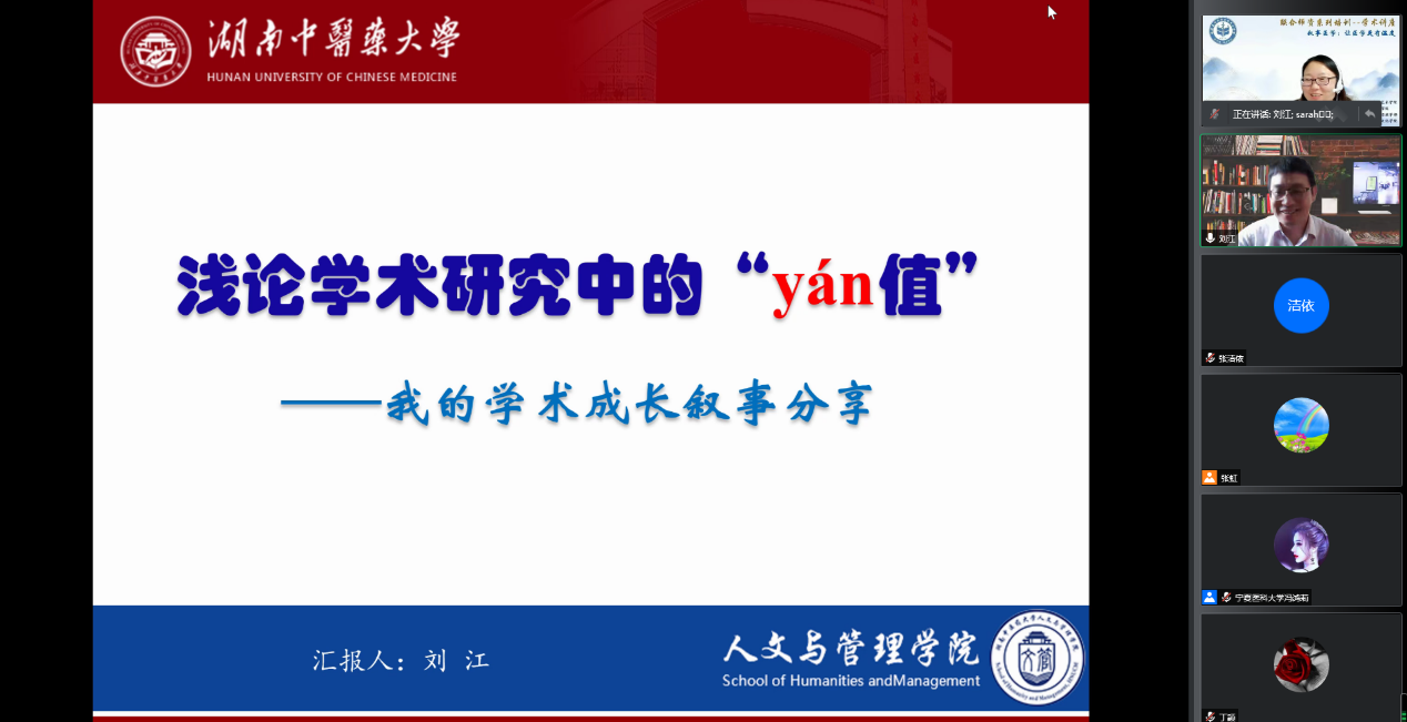 6月2日下午,湖南中医药大学副教授刘江应邀为外国语教学部教师开展线上学术讲座,外国语教学部20余位教师聆听了讲座。刘教授以“学术研究的三值”为主题,基于自己个人的学术成长,从“研值”、“言值”和“颜值...