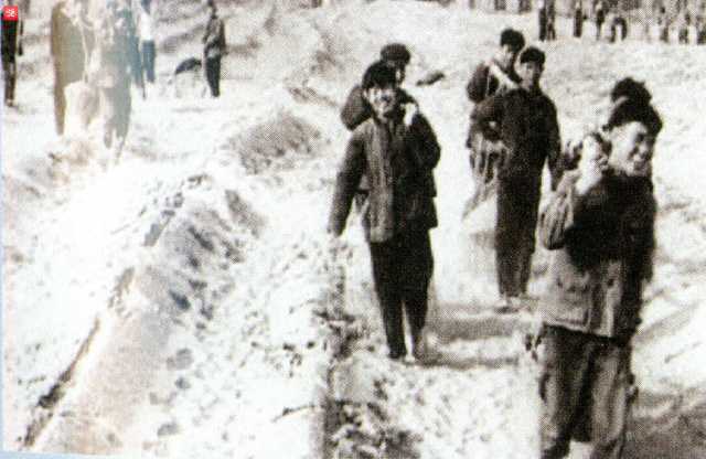 建校初期,教职工劳动场景。 1966年冬天,郑传经(前中)在五七干校拉粪送到农田。 1970年10月,老教授们在西干渠溿参加劳动。 1971年,教育革命领导小分队到左旗调查缺医少药情况并为当地群众送医送药(前为...