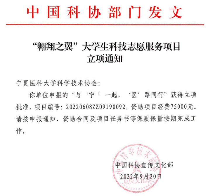 近日,中国科协发布了关于“翱翔之翼”大学生科技志愿服务项目申报资助的通知,学校科协组织申报的与“与 ‘宁’一起,“ ‘医’路同行”项目获批立项。该项目为本年度自治区唯一立项项目,通过项目实施,将为提...
