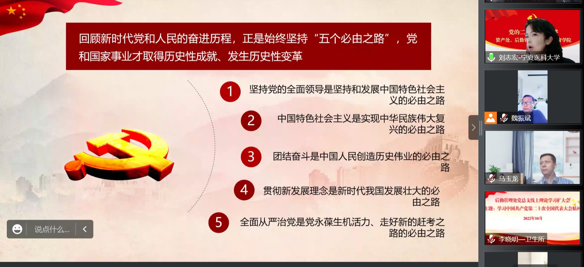 11月12日上午,学校副校长刘志宏教授为后勤管理处党总支、继续教育学院党总支、资产管理处党支部党员干部职工开展学习贯彻党的二十大精神线上专题宣讲活动。宣讲会由资产管理处党支部书记魏振斌主持。会上,刘志...