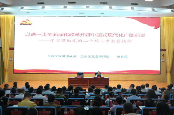 8月29日,学校在雁湖校区尚行会议中心召开学习贯彻党的二十届三中全会精神自治区宣讲团报告会,学校领导,正副处(科)级干部和师生代表参加。 会上,自治区宣讲团成员、自治区党委讲师团成员黄育荣作了题为“以...