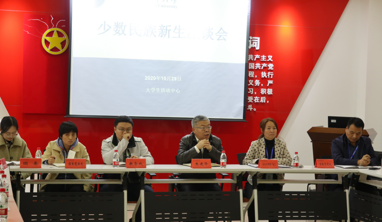 10月29日下午,2020级少数民族新生座谈交流会在雁湖校区大学生活动中心举行。学校党委副书记朱建华、相关单位负责人、辅导员及少数民族新生代表共计45人参加。会议由学生工作部(处)副处长李亚红主持。朱建华代...