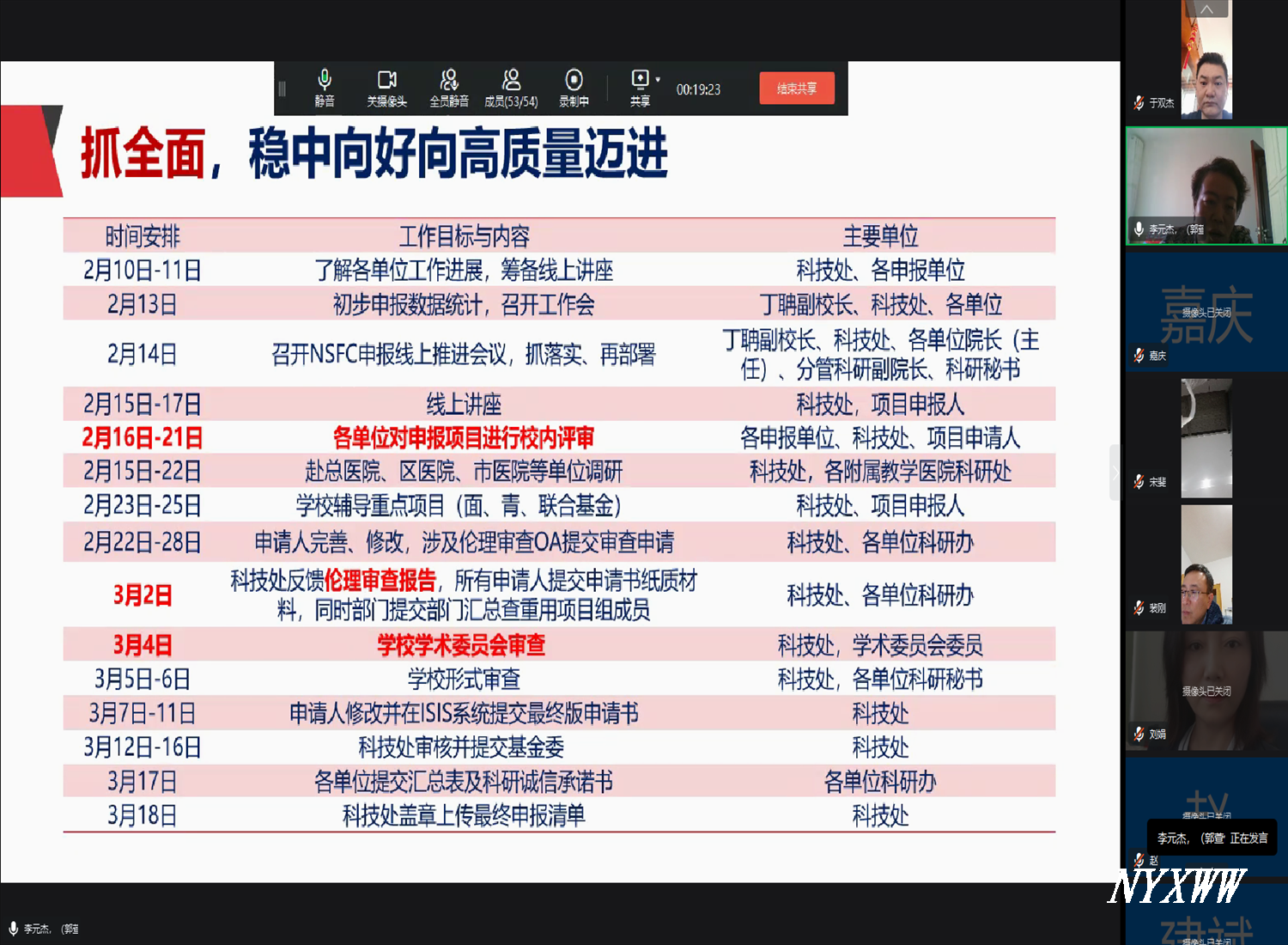 2月14日,为确保学校2022年度国家自然科学基金的申报工作高效、高质量进行,有效提高国基金项目申报质量和资助率,学校通过线上钉钉会议的形式召开2022年国家自然科学基金项目推进会,学校基础医学院、公共卫生与...